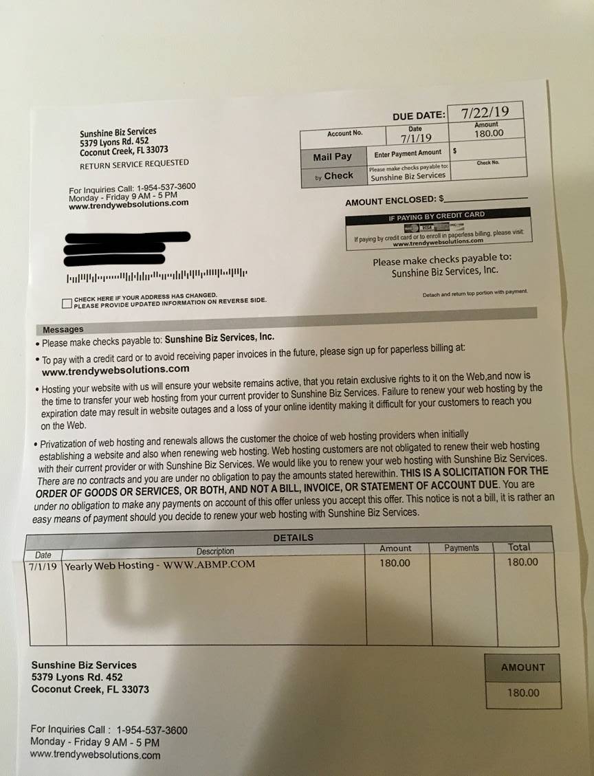 ASCP members have recently shared instances of receiving unsolicited "offers" from various web hosting companies that appear as invoices and imply that members need to pay a certain dollar amount to maintain their website listing as outlined in the news story at www.abmp.com/updates/news/web-hosting-scam-targets-massage-therapists.